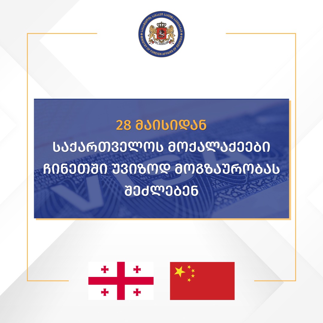 საგარეო საქმეთა სამინისტროს ინფორმაციით, 28 მაისიდან საქართველოს მოქალაქეებს შესაძლებლობა მიეცემათ, ჩინეთის სახალხო რესპუბლიკაში უვიზოდ გაემგზავრონ, არაუმეტეს 30 დღისა.